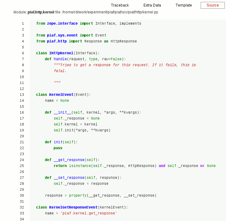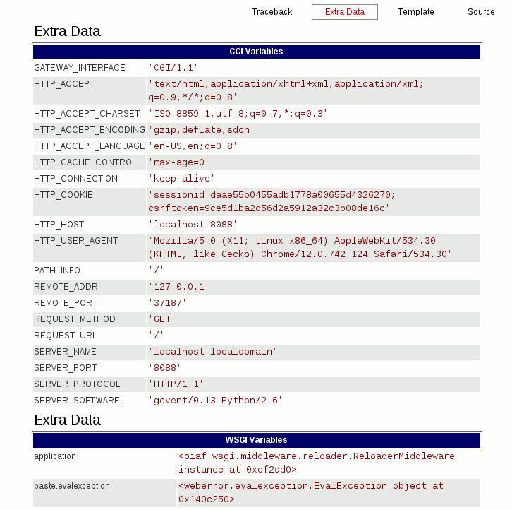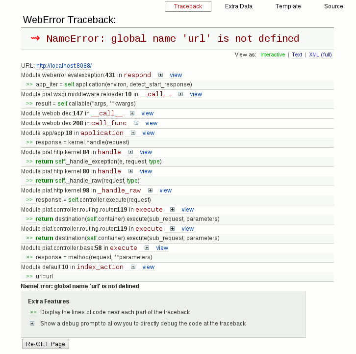 This is great, but looks like a hell to integrate in some home-made application… Actually it is not! Weberror contains a WSGI middleware that will enpower any WSGI compliant application with its features. Let’s add it to our last week’s application.